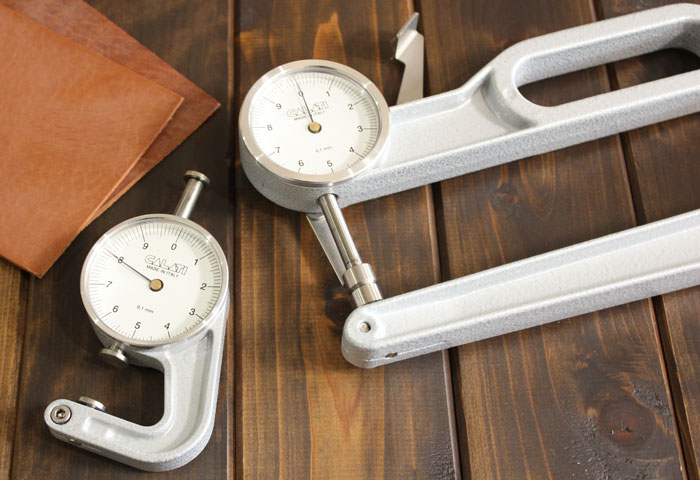 革用ゲージを使うことで、ノギスでは測ることができない革の中心部まで測ることができ、計測部分が平面になっているためより正確に計測することができます。